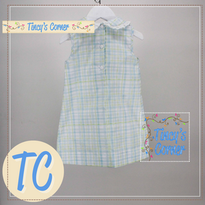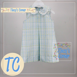 This girl's blue and green plaid dress is perfect for any occasion. Made with high-quality materials, it provides comfort and style. The classic plaid pattern adds a touch of sophistication while the blue and green color combination adds a fun and playful twist. Your little one will look and feel great in this dress.