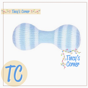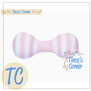 Sweet and simple this dumbbell shaped knit rattle makes a perfect gift for baby showers and birthdays!