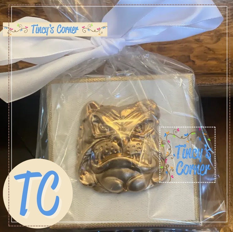 The perfect Game Day or Dorm decor! This gold gilded bulldog head accents a gold edged 4x4 canvas. Awesome detailing to this piece!