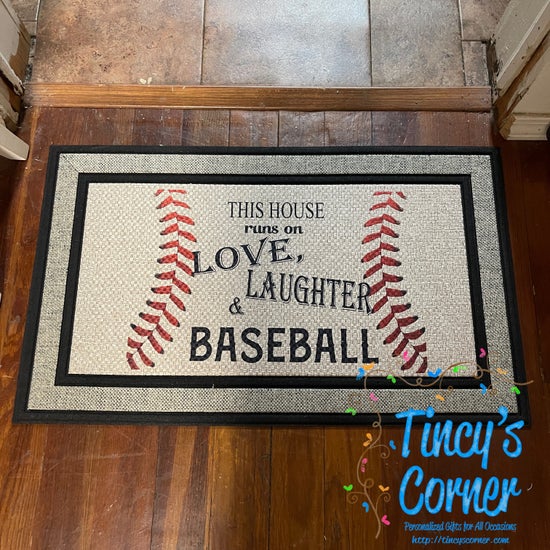 House Runs on Love Laughter Baseball Door Mat