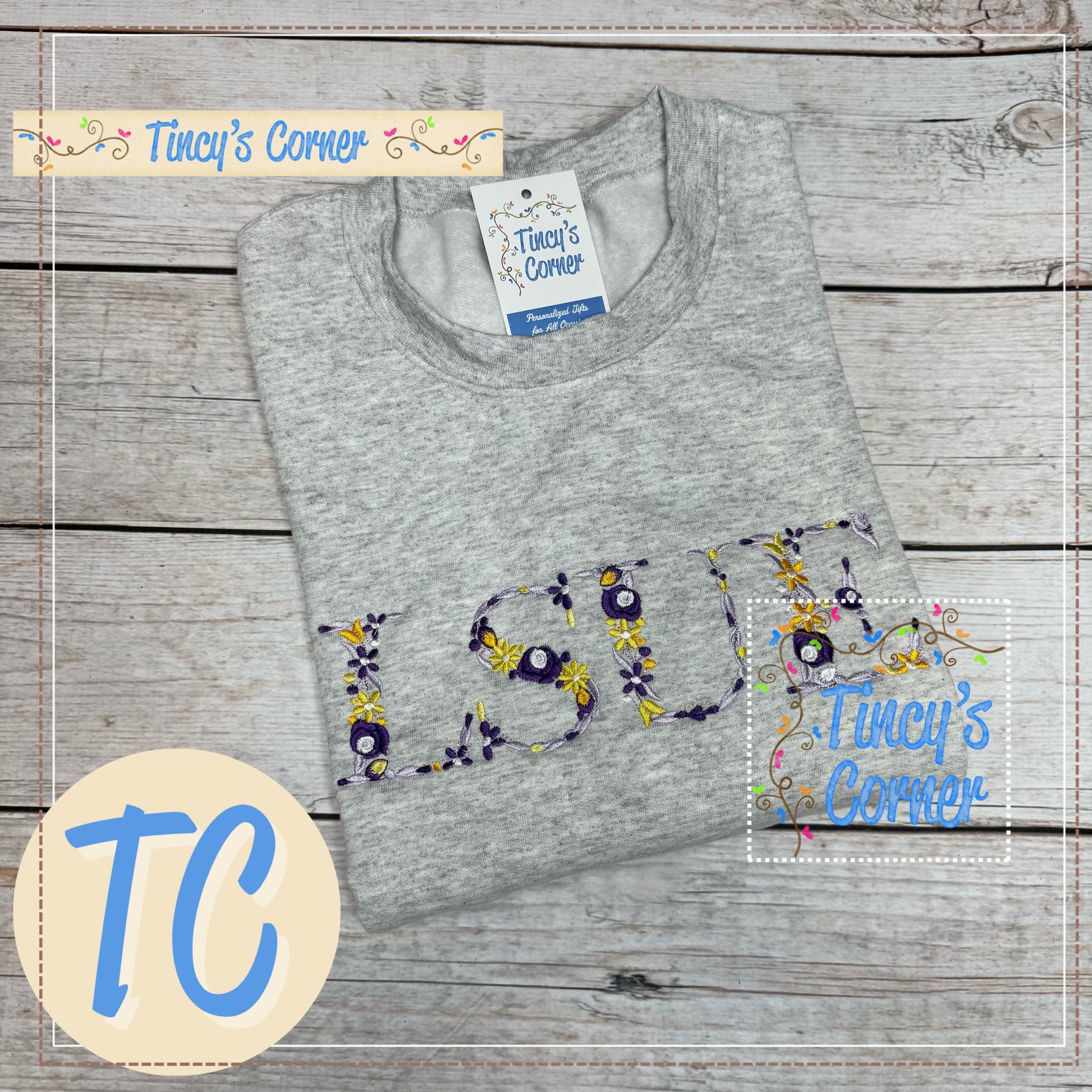 - SHS Floral embroidered in various thread colors - State in the order notes at checkout if you would like different thread colors. See photo in this listing.