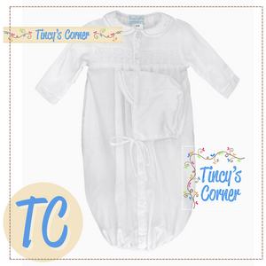 Our basic neutral smocked bag features a simple geometric smocked insert across the front with faggoting on the trim and a button down front for easy on and off. Matching hat is included. Matches perfectly with our neutral smocked blanket for a great baby shower gift!