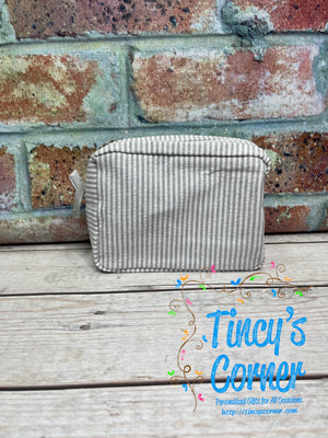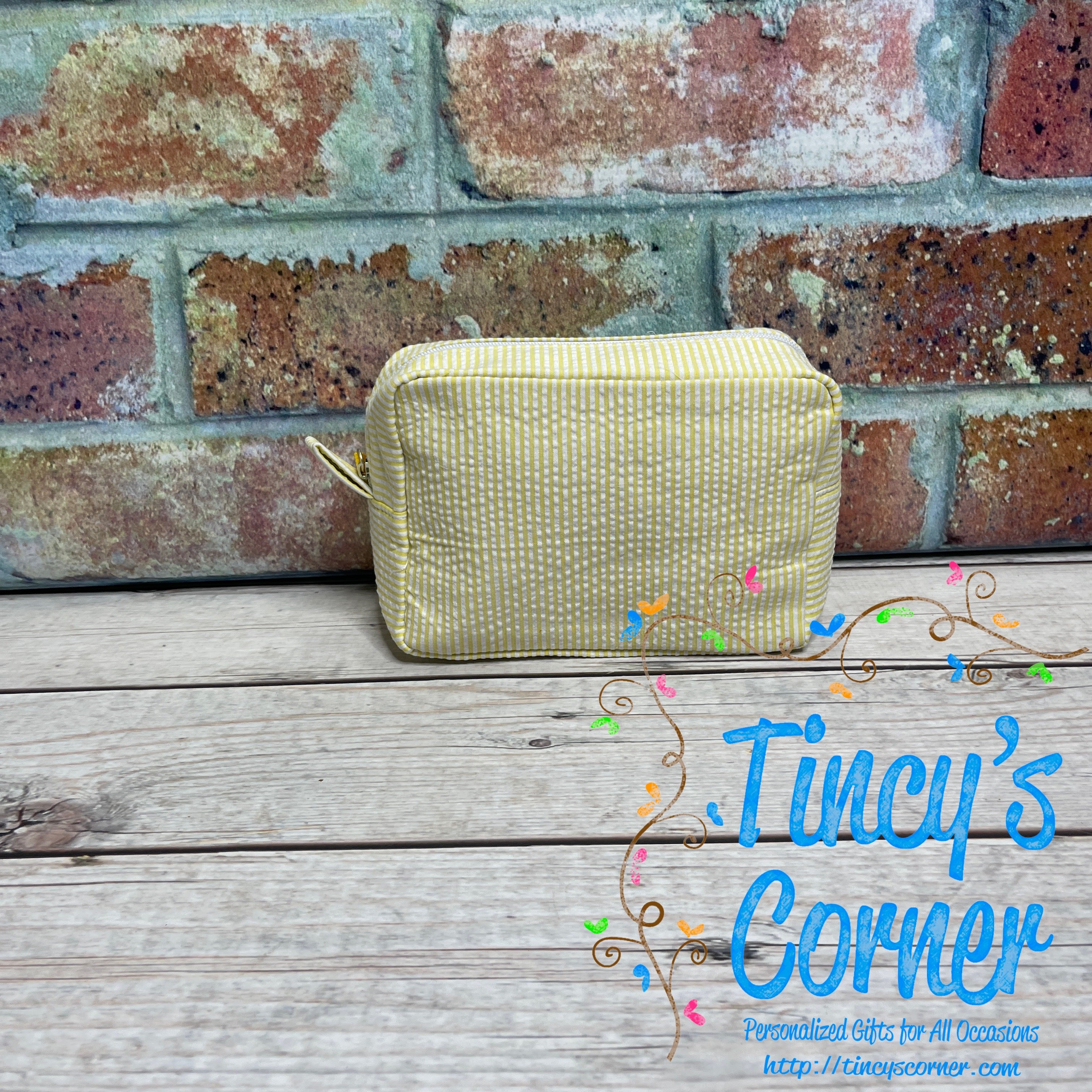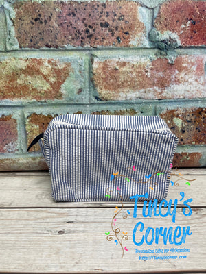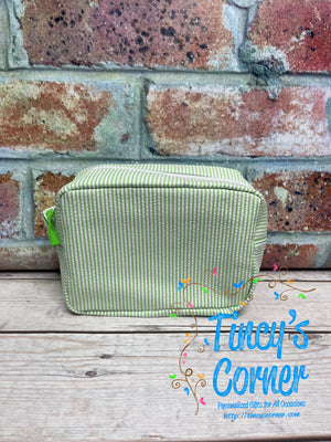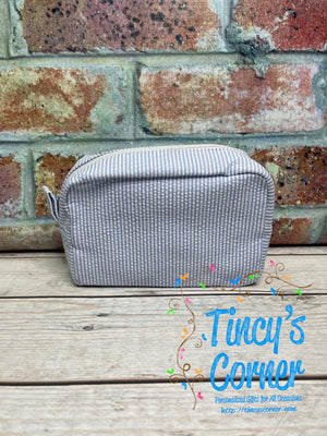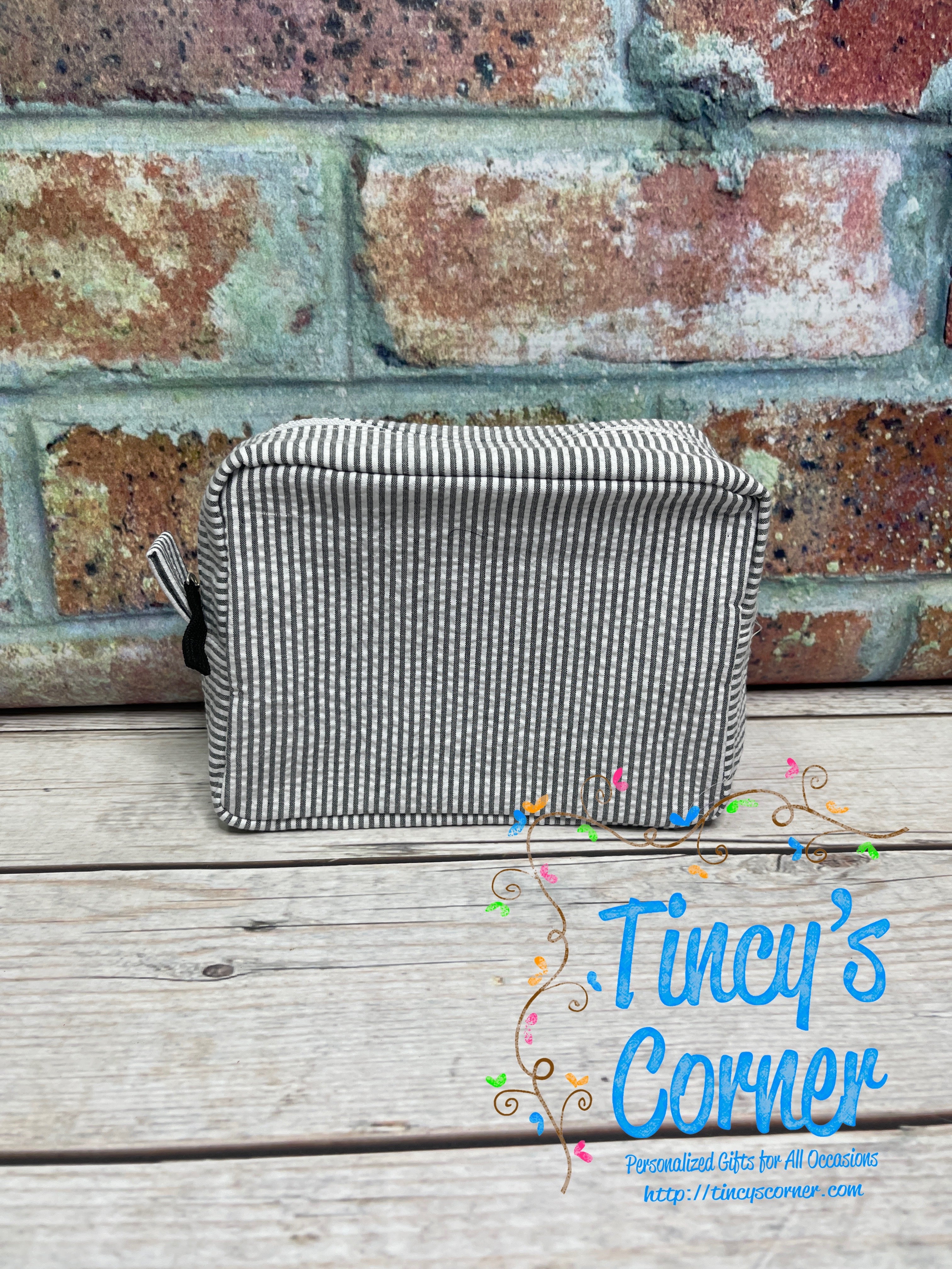 Our seersucker toiletry bags are a perfect match to our seersucker backpacks and duffle bags! Use them to hold all your toiletries, cosmetics, or even hair bows when you travel. Also, perfect to hold small treasures and toys for little ones!