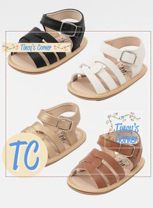 These adorable Strappy Cross-Front Baby Sandals will have your little one strutting in style! The unique braided front design adds an extra touch of charm, while the ankle strap with Velcro closure ensures a secure fit. Designed by Marie Nicole Clothing, these sandals are perfect for every fashion-forward baby girl!